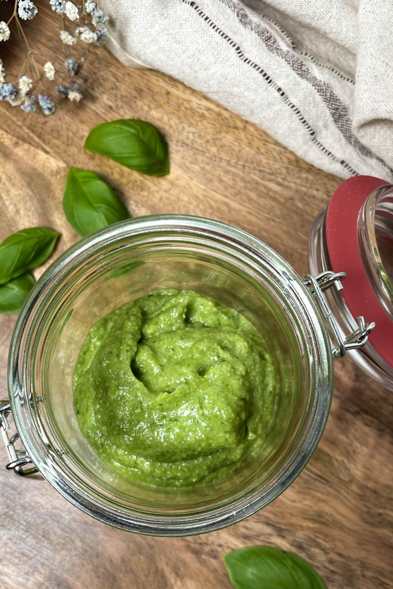 Das Pesto lässt sich luftdicht verschlossen für kurze Zeit im Kühlschrank aufbewahren. Am besten solltest du es noch am selben Tag verbrauchen, da Avocados schnell oxidieren und braun werden. Das beeinträchtigt den Geschmack meist nicht, sieht aber nicht besonders appetitlich aus. Also am besten frisch zubereiten und direkt genießen, dann schmeckt‘s einfach am besten!